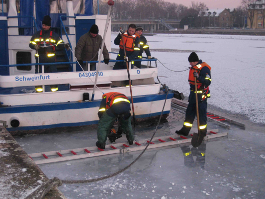 Schiff von Eismassen auf dem zugefrorenen Main eingeschlossen