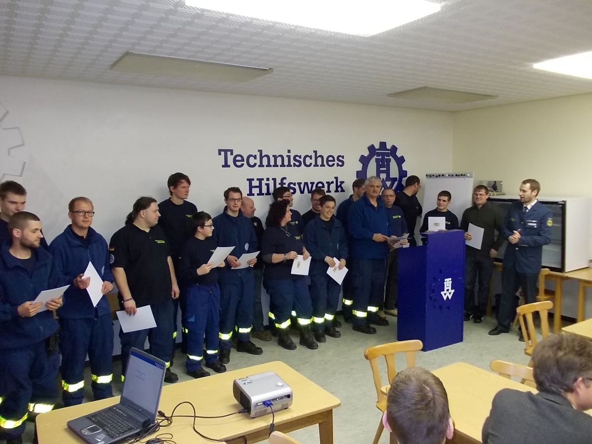 Die Helferinnen und Helfer, sowie unsere Jugendgruppe freuten sich zahlreiche Gäste begrüßen zu können. So erschienen als Vertreter der Stadt Schweinfurt Herr Jan von Lackum und Herr Jürgen Montag, sowie der Stadtbrandrat Andreas Oesterreich. Als weitere Gäste konnten wir die Herren Meyer (Verkehrinspektion), Reitmeier (Wasserschutzpolizei), Schlereth (Integrierte Leitstelle), Holzheid (Diakon, SBE), Dr.Mandewirth und Kaufmann (Maltheser Hilfsdienst), Moll (Bayerisches Rotes Kreuz) und Eisenhut (Arbeiter Samariter Bund) begrüßen. Nach einem kurzen Grußwort von Herrn von Lackum gab unser Ortsbeauftragte Jörg Opper einen Rückblick auf das Jahr 2013. Besonders hervorzuheben war, dass in 2013 insgesamt circa 20.000 Dienststunden geleistet wurden -- gegenüber 2012 nochmals eine deutliche Steigerung, die auch auf den Hochwassereinsatz zurückzuführen war.