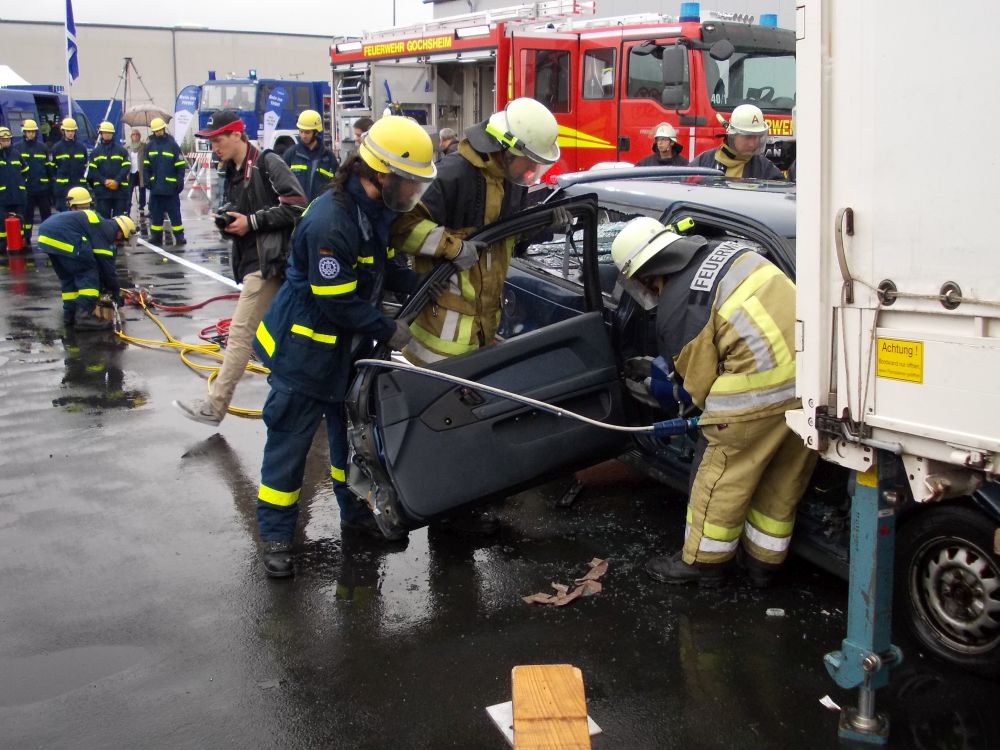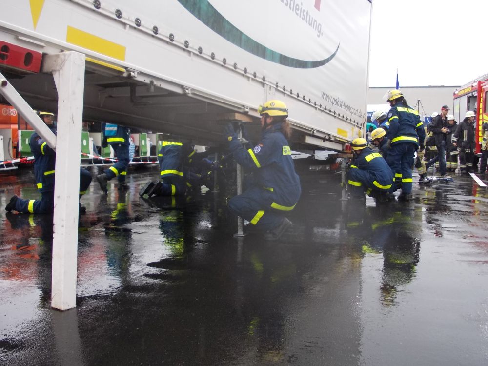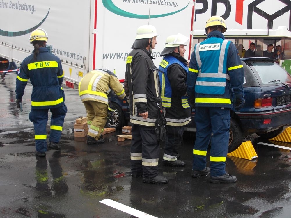 Hand arbeiten. In der Schauübung war ein PKW unter einen