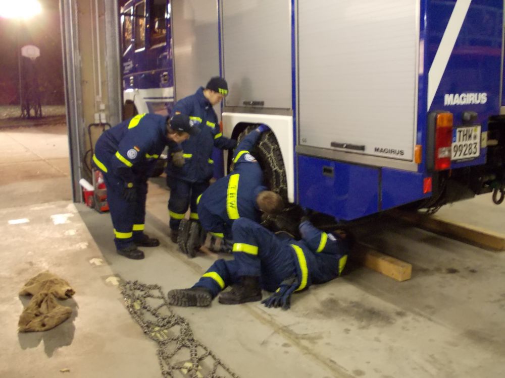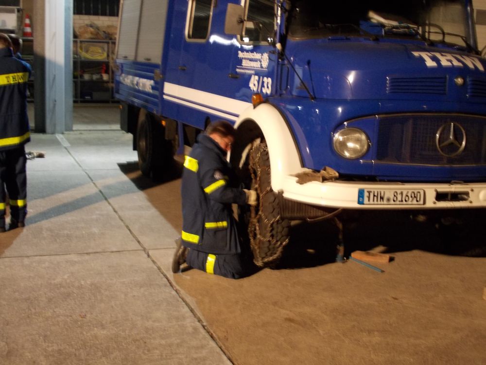 Die Kraftfahrer des THW-Ortsverbandes Schweinfurt trafen sich am Freitagabend nach der Arbeit zur alljährlichen Kraftfahrerausbildung. Gestartet hat die Ausbildung mit der Theorie. Im Mittelpunkt standen die Aufgaben und die Verantwortung des Kraftfahrers vor, während und nach der Fahrt. Die Fahrzeugkontrolle vor Fahrtbeginn mit der entsprechenden Dokumentation, das Fahren unter Einsatzbedingungen und die Verantwortung des Fahrer in dieser Situation, sowie die Kontrolle nach der Fahrt mit dem Tanken und der möglichen Schadensmeldung und auch der Werkstattauftrag waren Inhalte der Theoriestunde. Danach ging es an den praktischen Teil. Entsprechend der Jahreszeit wurde das Aufziehen der Schneeketten geübt.