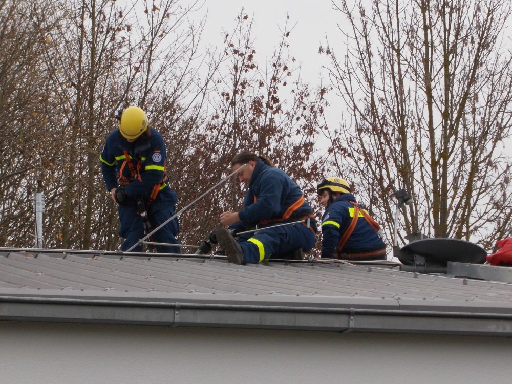 Die Funkantenne auf dem Dach der Unterkunft musste repariert und wieder aufgebaut werden. Dazu haben sich drei Helfer mit Sicherungsausrüstung auf das Dach begeben. Auf den Fotos ist der Elektrofachmann beim Zusammenbau des Antennenkopfs zu sehen. Zum Aufstellen des Mastes waren dann die vereinten Kräfte aller drei Helfer notwendig.