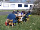 Spontan wanderte die Führung des THW-Ortsverbandes Schweinfurt zu ihrer Ortsausschusssitzung ins Freie und genoss so nebenbei auch die warme Nachmittagssonne. Während ein Teil noch Tische herantrug, bereiteten andere schon die Sitzung vor.
