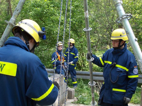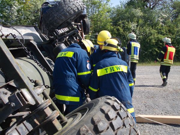 Seile der Winden am Tankanhänger befestigt. Ein weiteres THW-SW-Team