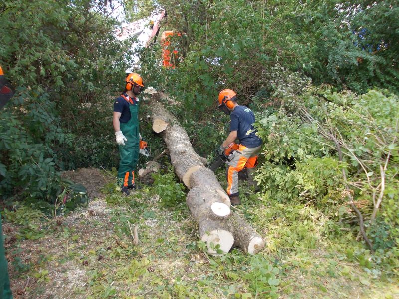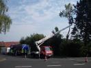 Im Rahmen der Ausbildung hatten die Helfer mit entsprechender Kettensägen-Ausbildung die Gelegenheit einen Baum von einer Hebebühne aus zu fällen. Es war eine weitere Erfahrung und hat Spaß gemacht.