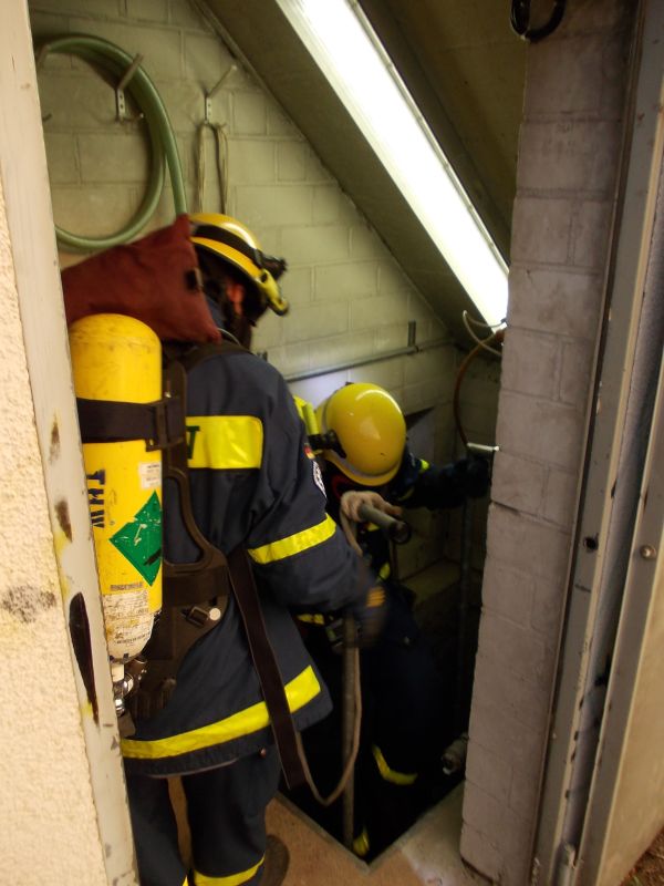 die ersten THW-Helfer unter Atemschutz in den Schacht abgestiegen
