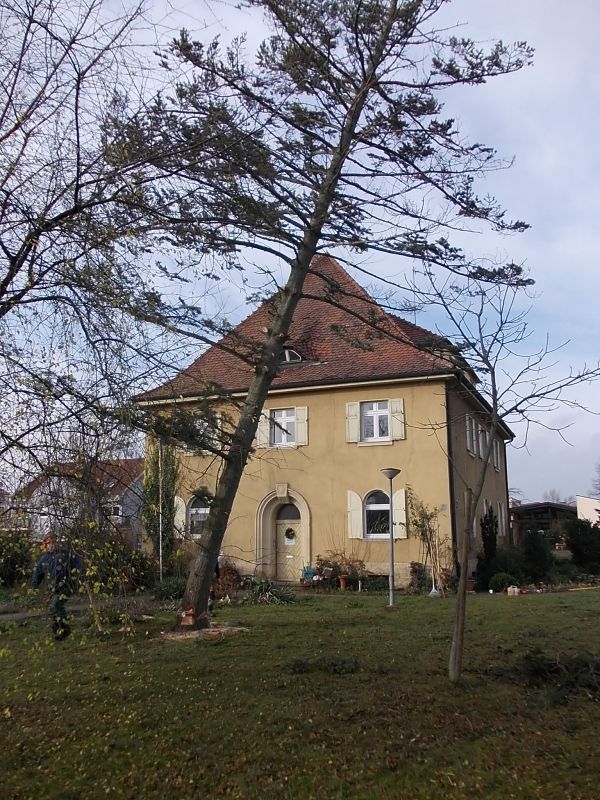 mit Neigung zum GebÀude und in der Fallzone stand ein junger Baum.