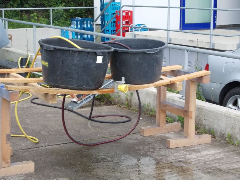 auf dünnen Latten stehende Wannen langsam mit Wasser voll. Durch das