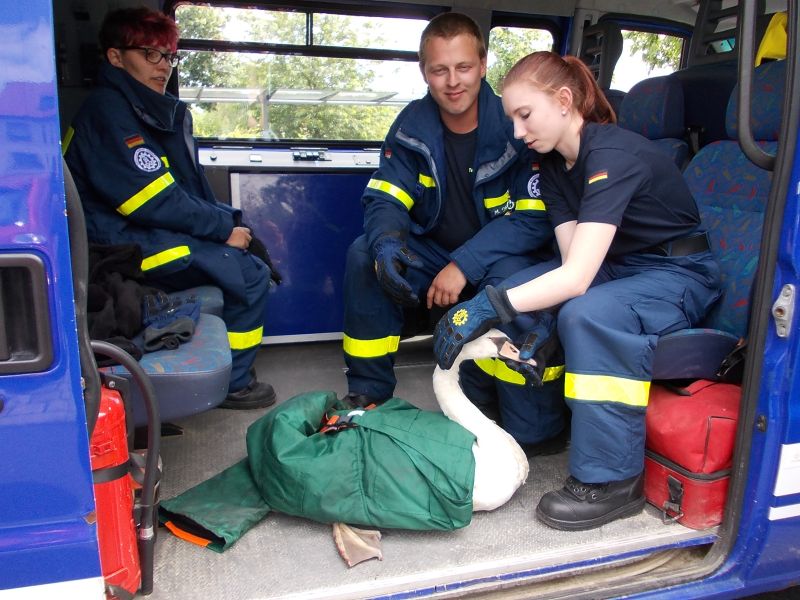 THW-Helfer den Schwan aus dem Uferdickicht befreien und sicher an