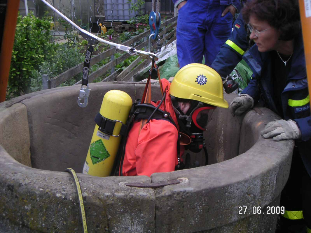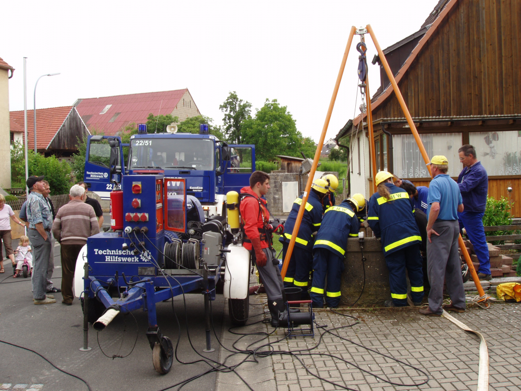 Im Rahmen einer THW Ausbildungsveranstaltung wurde Ende Juni ein Brunnen aus der 2. Hälfte des 19. Jahrhunderts instand gesetzt. Der Brunnen wurde vor ca. 40 Jahren stillgelegt, ist 10m tief und die Wasserlinie beginnt bei 6,80m. Insgesamt verfügt der Brunnen über ein Wasservolumen von ca. 3m³ Die zu bewältigenden Aufgaben umfassten: - Brunnen leer pumpen - Brunnen von Fremdkörpern ( Eisenstangen, Holzbrettern, Steinen) befreien - Bergung des alten Brunnengestänges - Säuberung des Brunnen mit Dampfstrahler Aufgrund einer Messungen mit dem Multiwarngerät wurde eine sehr hohe CO2 Konzentration festgestellt, weshalb im Brunnen nur mit schwerem Atemschutz gearbeitet werden konnte. Die Helfer, welche im Brunnen tätig waren, wurden mit dem Rollgiss gesichert und abgeseilt. An der Übung waren 12 Helfer der 1. Bergungsgruppe und der Fachgruppe Ortung beteiligt. Zum Einsatz kamen auch der GKWI und das Ortungsfahrzeug sowie die Polyma. Die Übung dauerte 5 Stunden.