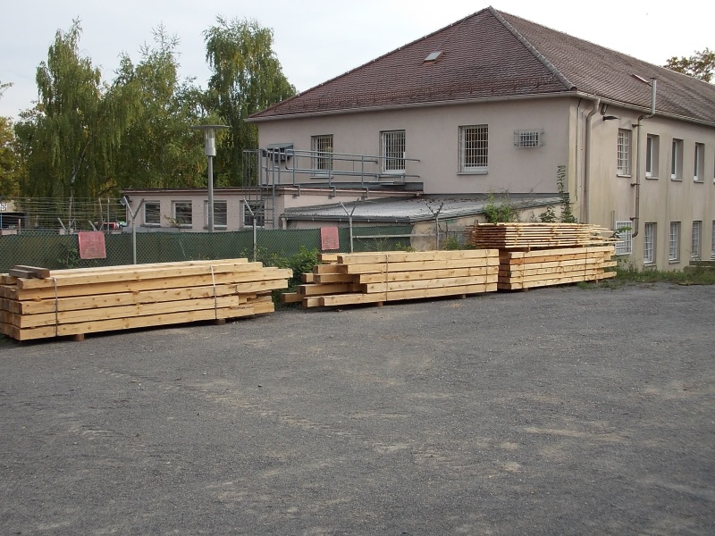 Das Holzlager ist ein wichtiger Bestandteil des Ortsverbandes. Hier liegen Rundhölzer, Kanthölzer, Bohlen und Latten für den Einsatz bereit. Was daraus entstehen kann, lernen die Helferinnen und Helfer in der Grundausbildung.