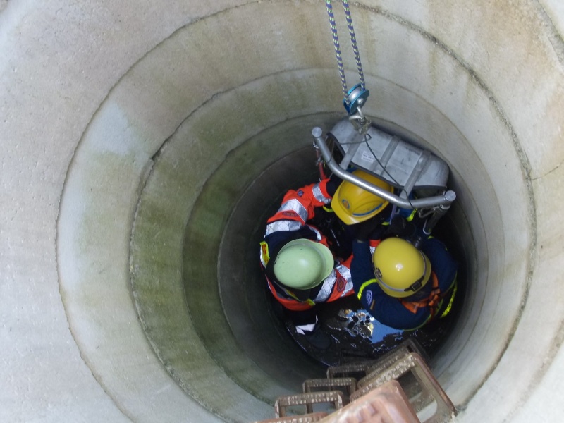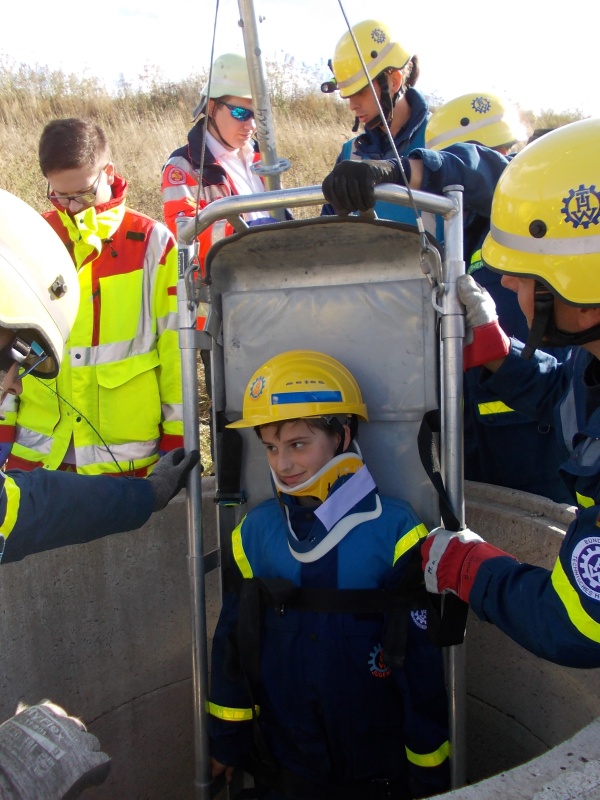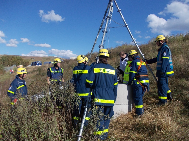 in den Schacht abgelassen. Eine THW-lerin sicherte gemeinsam mit dem