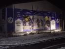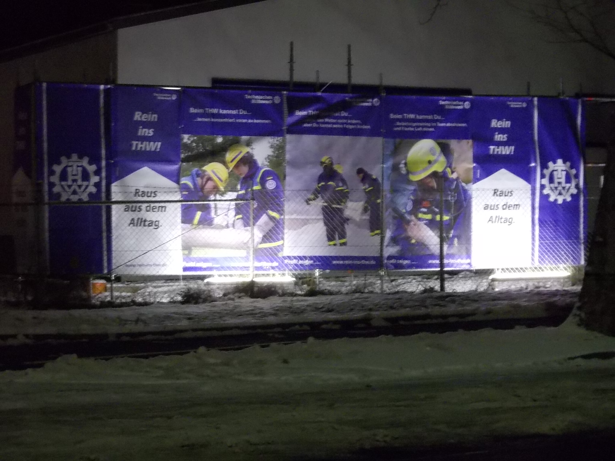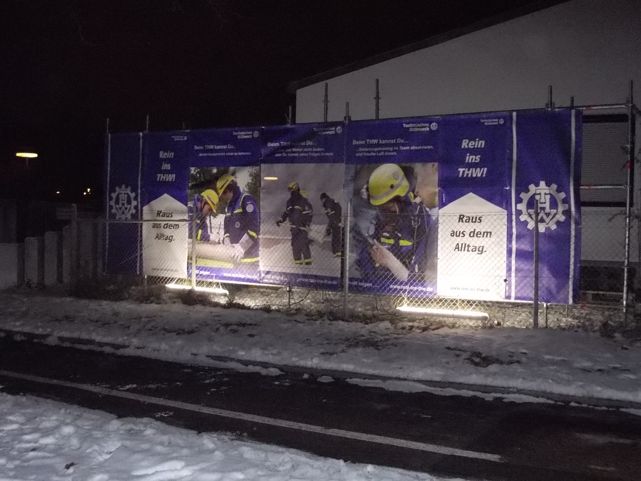 Um 17:00 Uhr trafen sich drei THW-ler und ein "helfender Vater" zum Aufbau des EGS für die Werbebanner. Später kam noch ein Alt-Helfer dazu. Gegen 18:30 Uhr wurde das vollendete Werk von der anderen Straßenseite aus begutachtet. Die Beleuchtung war noch nicht perfekt. Also wurden die Lampen an anderer Stelle angebracht -- und es hat gepasst.