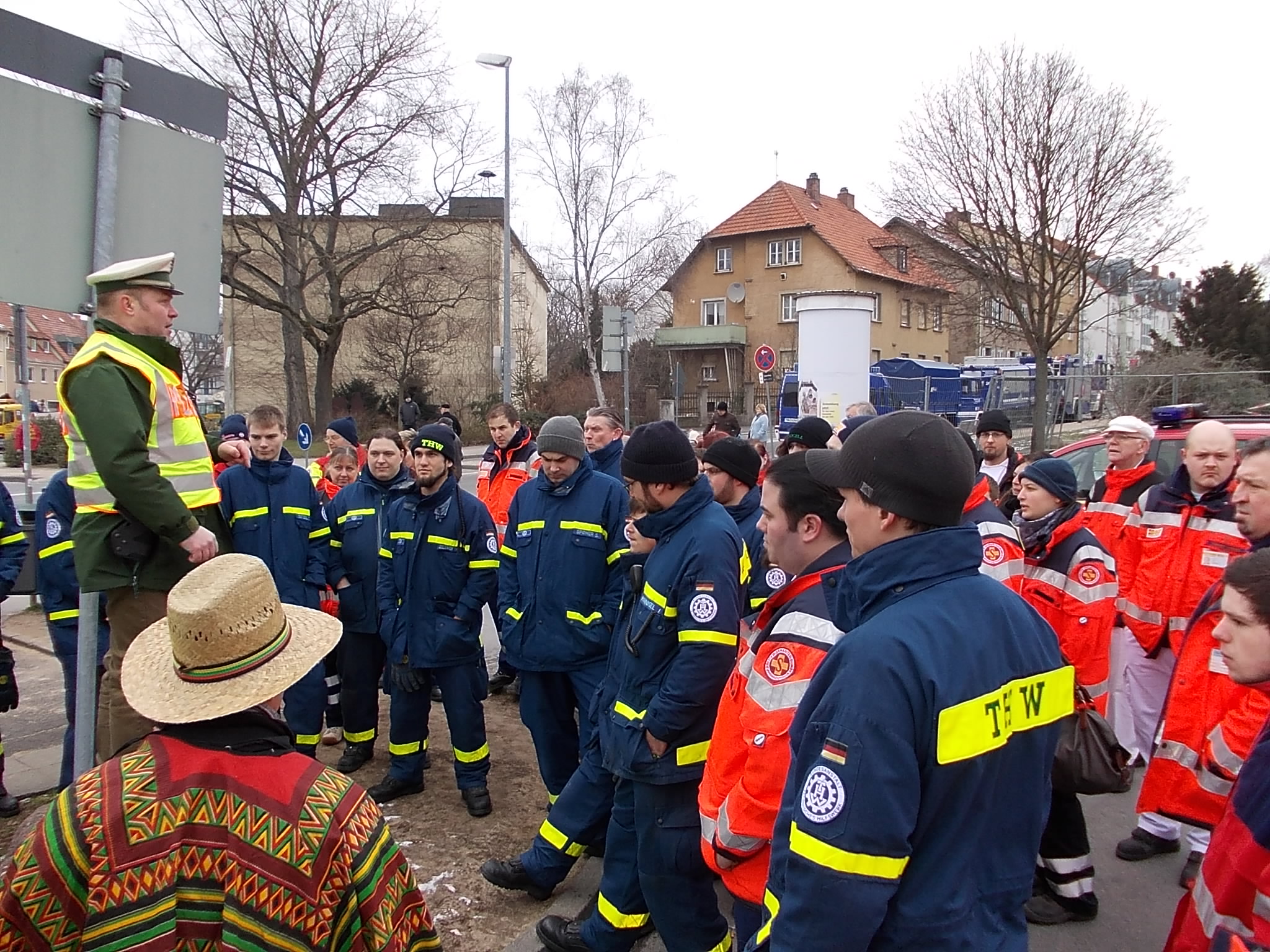 Der Einsatz fing aber schon lange vor Beginn des Faschingsumzuges an. Um 10:15 Uhr war Dienstbeginn in unserer Unterkunft. Nach der ersten Einteilung auf die Fahrzeuge fuhren wir mit dem Einsatzleitfahrzeug, den beiden Gerätekraftwagen und einem Transportfahrzeug zur Vorbesprechung zum ASB. Um 12:00 Uhr ging es dann zum Treffpunkt der Einsatzkräfte zum Theater. Hier bekamen alle Mitwirkenden der Hilfs- und Rettungsorganisationen von der Polizei die letzten Informationen. Ab 12:30 Uhr waren dann alle Einsatzstellen von den Helferinnen und Helfern besetzt.