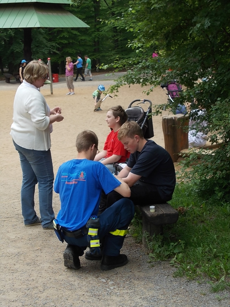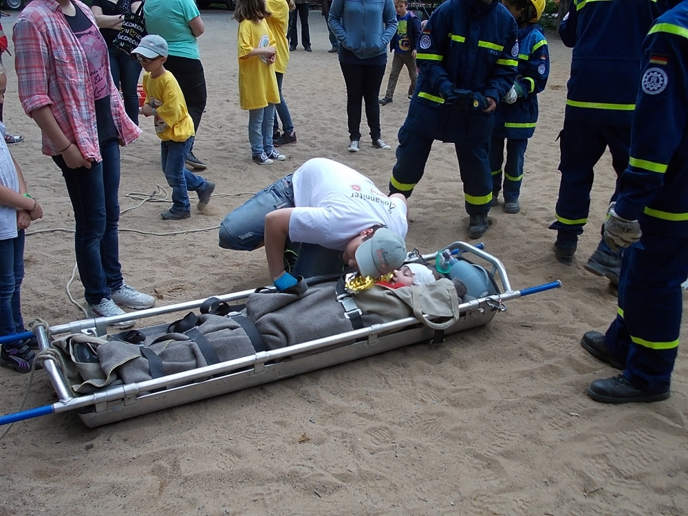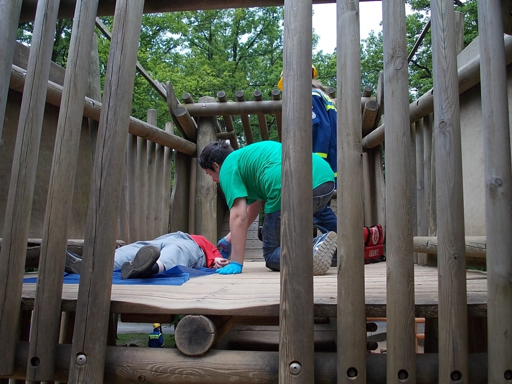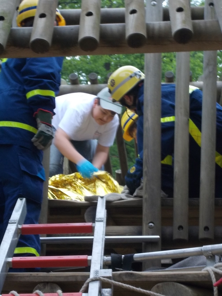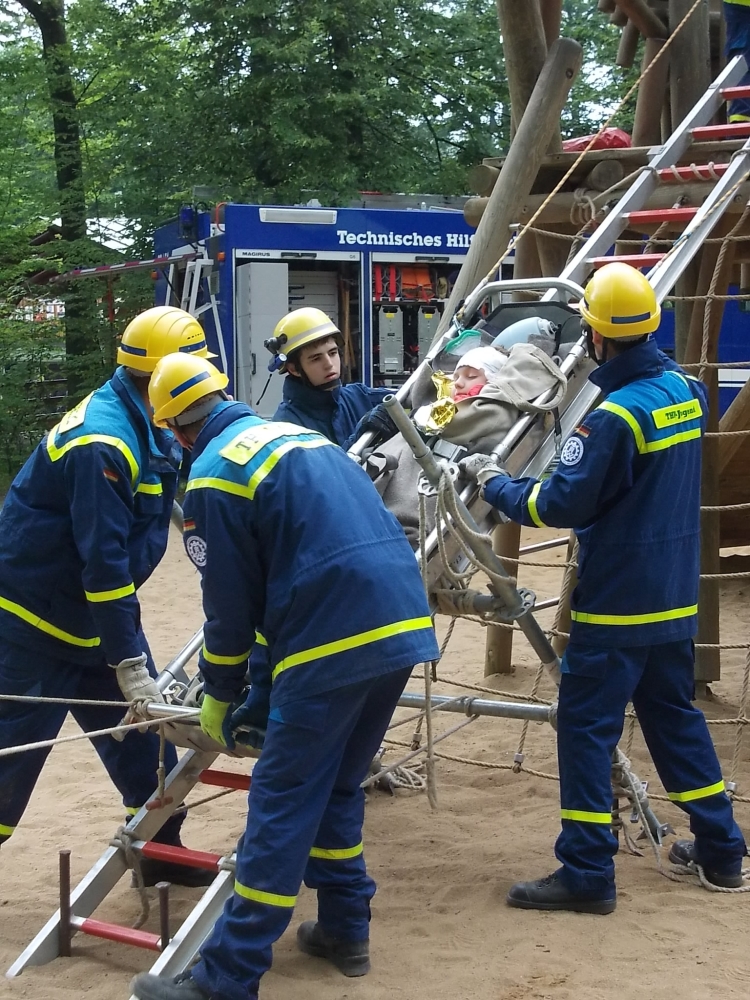 Die Jugend der Johanniter-Unfall-Hilfe (JUH) aus Giessen hat auf dem Rückweg von ihrem Bundeswettkampf in Regensburg Station beim THW in Schweinfurt gemacht. Zusammengefunden haben die beiden Jugendgruppen über ihren Ausbilder, der sich in Schweinfurt um die THW-Jugend kümmert und in Giessen neben seiner beruflichen Weiterbildung bei der JUH tätig ist. Die Johanniter-Jugend traf erst nach Mitternacht in Schweinfurt ein, wo sie schon von der THW-Jugend erwartet wurde. Nach dem Aufbau der Schlafstellen und dem ersten Beschnuppern ist es auch langsam still in der Unterkunft geworden. Beim Frühstück hat sich jeder bei seinen vertrauten Gesichtern an den Tisch gesetzt – das sollte sich aber im Laufe des Tages ändern. Es ging in den Wildpark an den Eichen zu einer gemeinsamen Übung. Zwei Jugendliche der JUH wurden geschminkt – fertig war der „Unfall“ auf dem Spielplatz. Die beiden Jugendgruppen hatten vorher noch nie zusammengearbeitet – OK – beim Start ruckelte es daher auch etwas, aber dann kamen sie in Fahrt. Der eine Verletzte wurde sehr schnell gefunden, versorgt und zum Sammelplatz an das Einsatzfahrzeug gebracht. Beim zweiten Verletzten war die Lage etwas verzwickter – er lag auf dem „Riesen-Elch“. Während die Johanniter-Jugend den Verletzten versorgte und betreute, baute die THW-Jugend eine „Leiterrutsche“, um den Verletzten mit einer Schleifkorbtrage von dem Klettergerüst zu transportieren. Nach gelungener Aktion gab es von den Zuschauern auch den verdienten Beifall. Gleich nach der Übung wurden von den beiden Jugendgruppen schon die nächsten gemeinsamen Treffen angedacht. Über das gemeinsame Mittagessen hinaus, bis zur Abfahrt wurden die Stimmen für einen Besuch in Giessen, oder auch ein zweites Treffen in Schweinfurt immer lauter. Alle hoffen auf ein Wiedersehen - besser kann eine Zusammenarbeit nicht laufen.